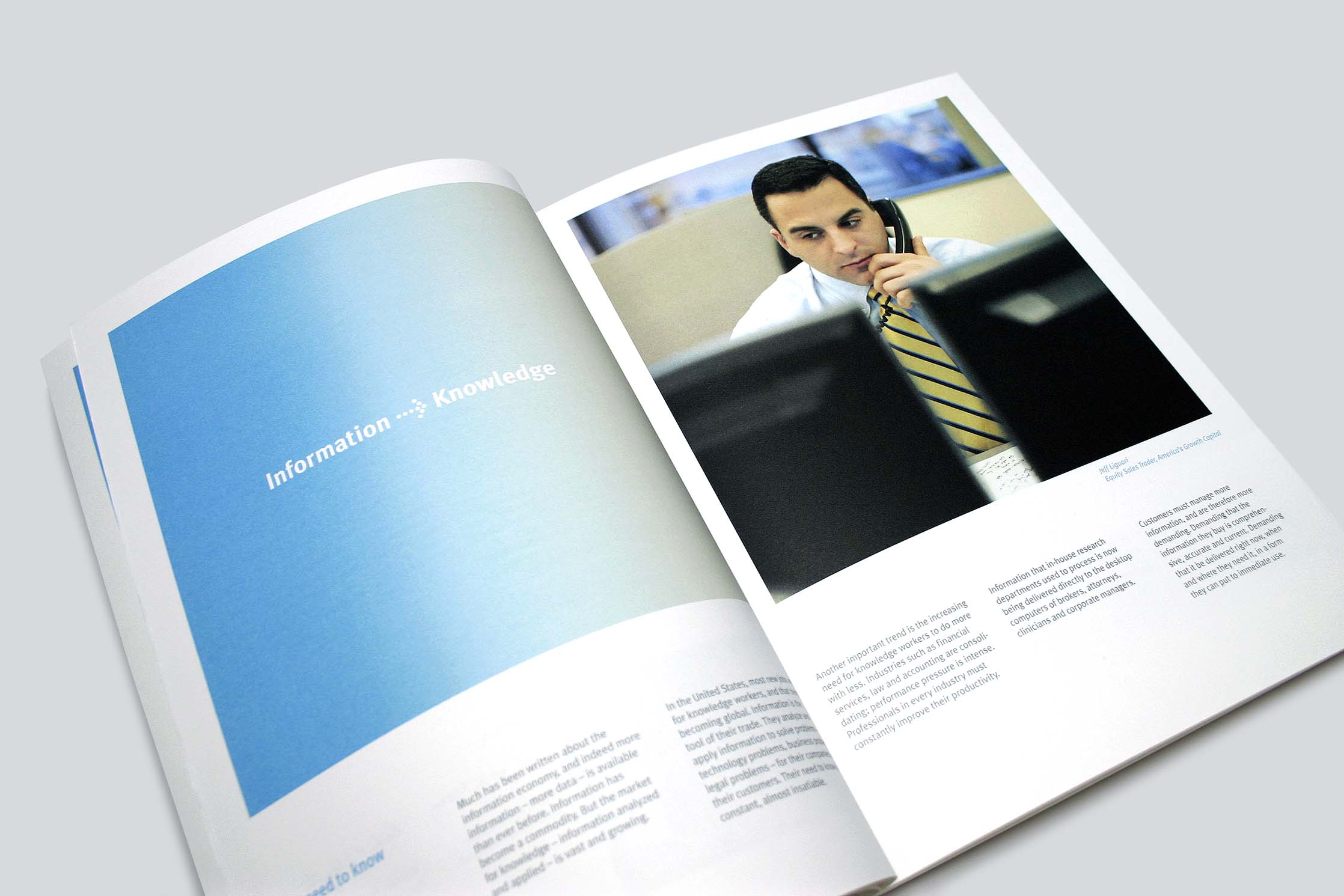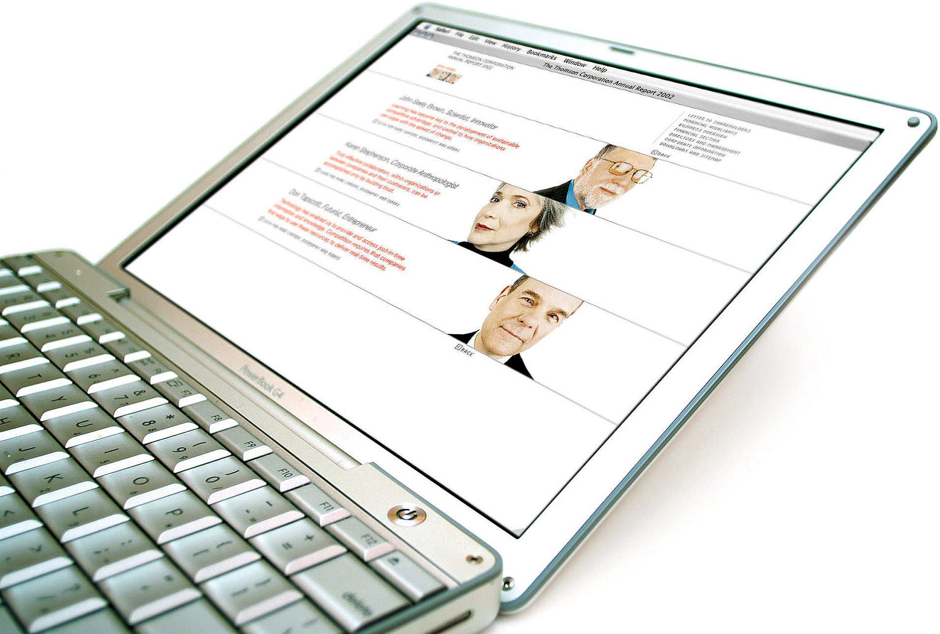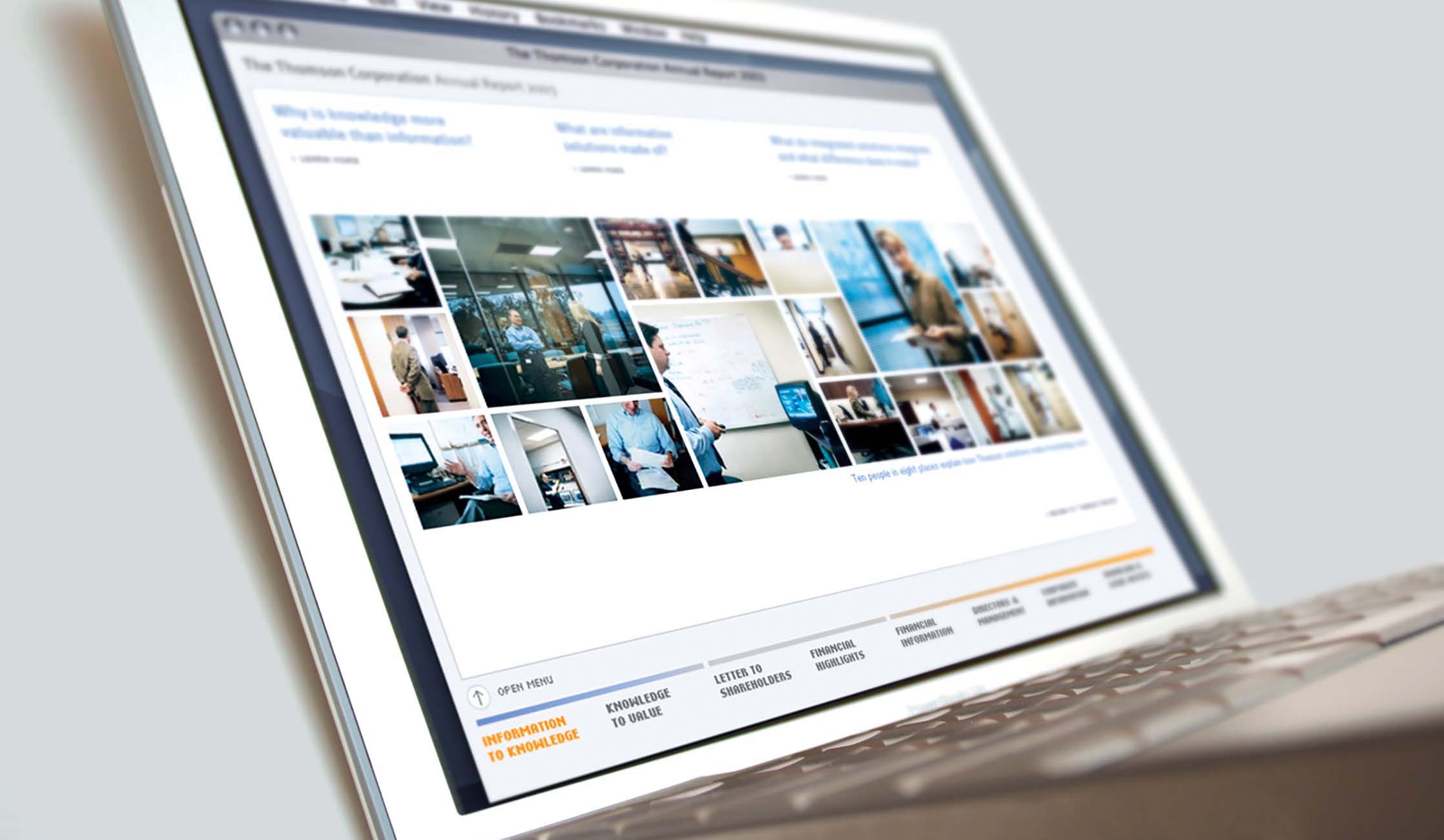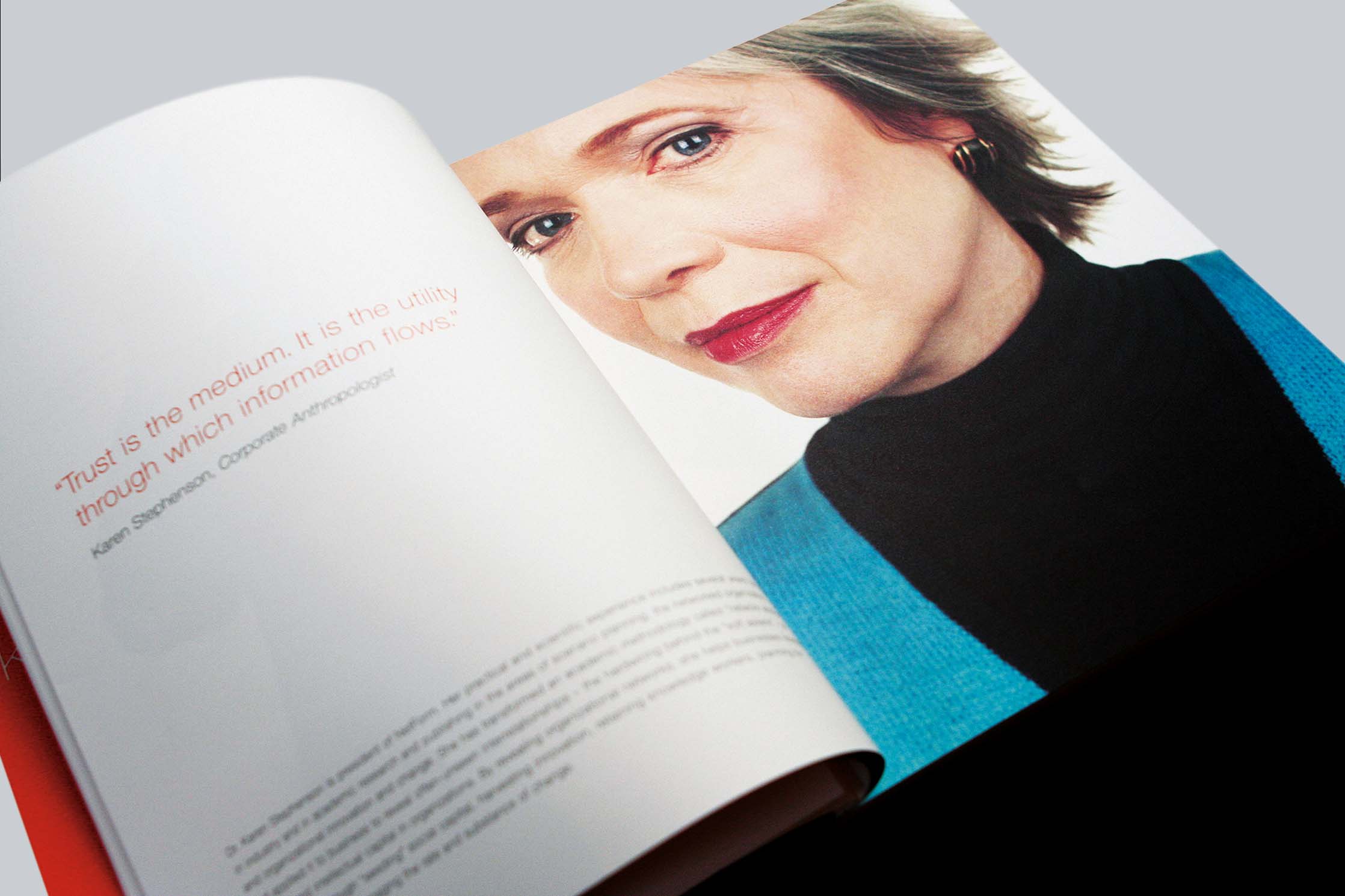 The annual report we created featured a series of well known experts speaking to the context Thomson was entering, that of information services. They addressed the coming digitization of the knowledge economy rather than directly endorsing or praising Thomson. Readers could use their own judgement to find a place for the company in the space described by the featured experts. Trust and credibility for Thomson were established through positioning Thomson as a reliable conduit or medium for information – not as attention-seekers making a hard sell, but as the connective tissue through which perspectives, analysis, and facts flowed.